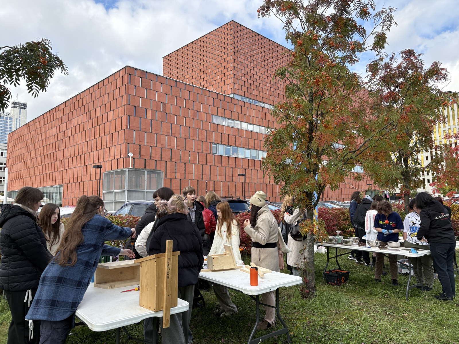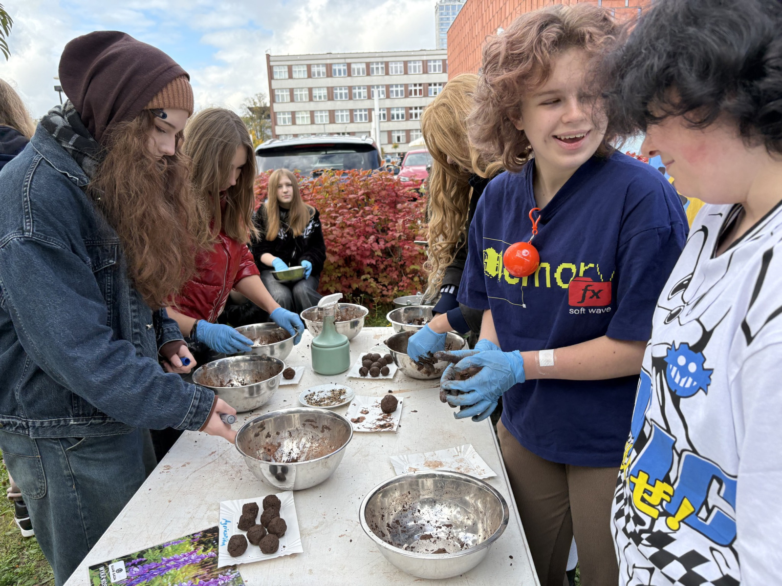 Po akcji sadzenia drzewa i krzewów, jak co roku, zespół Klubu Gaja zaprosił uczennice i uczniów do udziału w warsztatach ekologicznych na temat ptaków, owadów i ich wzajemnych zależnościach ze światem roślin. Zajęcia połączone były z praktycznymi pracami m.in. budową budek lęgowych dla ptaków czy lepieniem kul z nasionami kwiatów polnych.