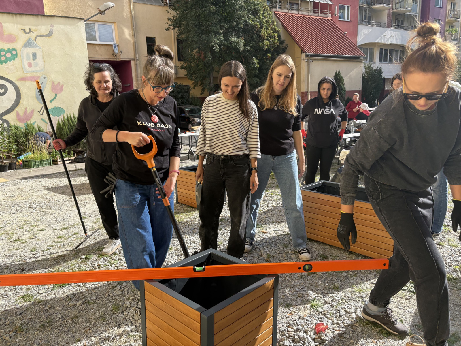 Podczas akcji, edukatorki i edukatorzy Klubu Gaja razem z wolontariuszkami i wolontariuszami EY GDS Poland zamontowali drewnianą ławkę, ustawili wysokie donice, które zostały obsadzone lilakami, tawułami, sesleriami i ożankami. Na podwórku udało się posadzić drzewo – klona ginnala, które pięknie barwi się jesienią. W żwirowym podłożu swoje miejsce znalazły także różne odmiany niskich rozchodników. Dzięki wspólnej pracy żwirowy parking zmienił się w mały zakątek zieleni, w którym posadzono aż 92 roślin!