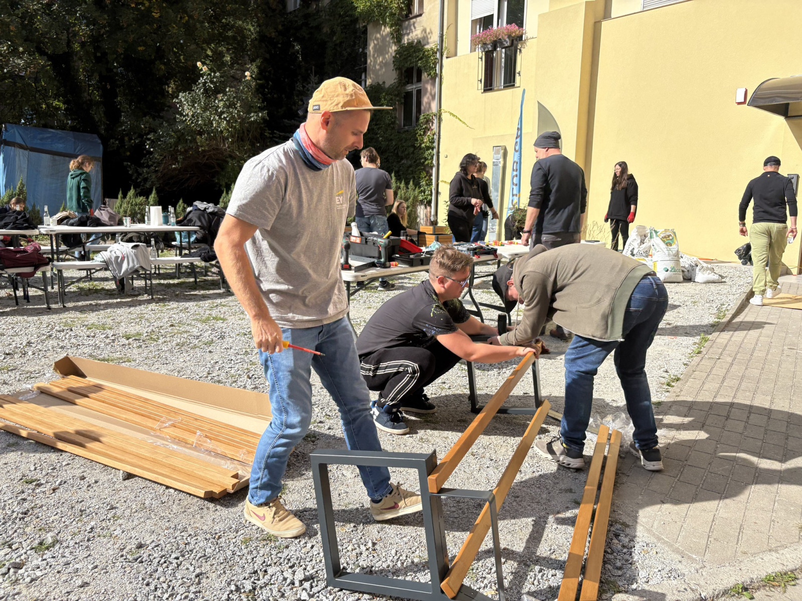 Zagospodarowanie żwirowego podwórka Dziennego Domu Opieki Wytchnieniowej „Piórko” było nas dużym wyzwaniem (twarde podłoże żwirowe i duże nasłonecznienie), ale udało nam się dokonać nasadzenia krzewów, bylin i traw w pięknych drewnianych donicach. Na podwórku zaprojektowano także miejsce na jedno nieduże i rozłożyste drzewo. Akcja wolontariatu z EY GDS Poland, która odbyła się 26 września, tradycyjnie rozpoczęła się powitaniem uczestniczek i uczestników oraz wprowadzeniem ich w kontekst miejsca oraz sytuacji związanej ze stanem środowiska i zmianami klimatu.